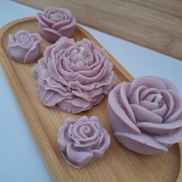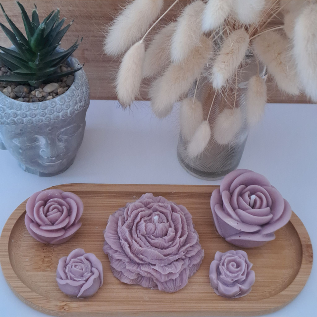 Cet élégant plateau réunit 2 bougies moulées en forme de fleurs – une pivoine et une rose – ainsi que 3 fondants parfumés.