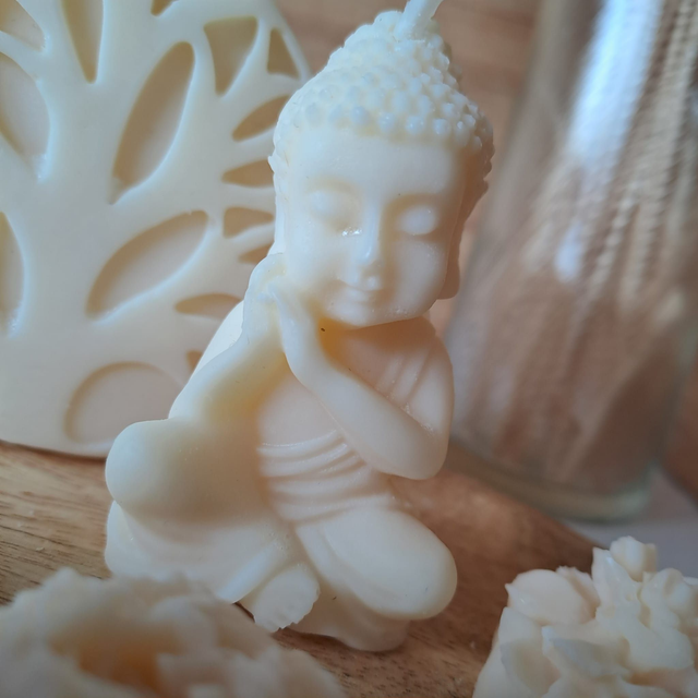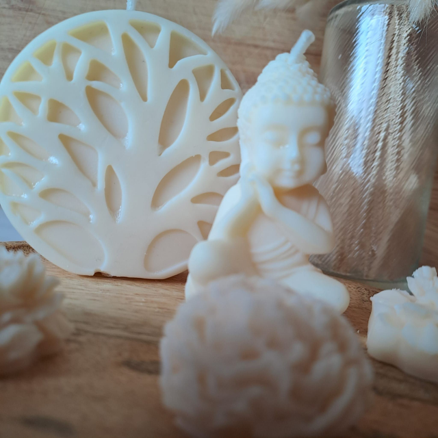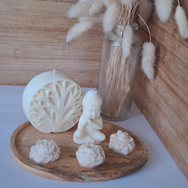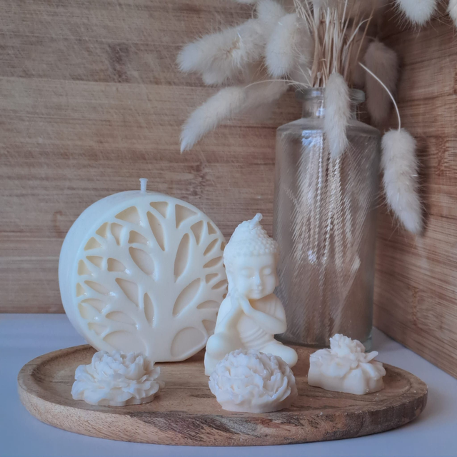Présentées sur un élégant plateau en bois, les bougies Arbre de Vie et Bouddha créent une atmosphère zen, parfaite pour la méditation ou la détente.